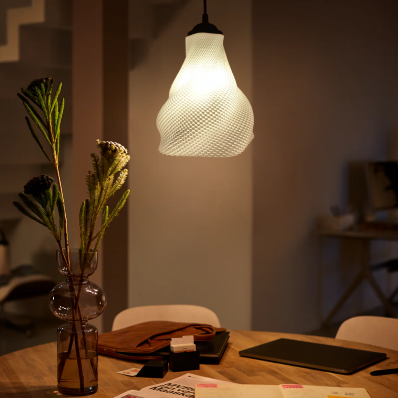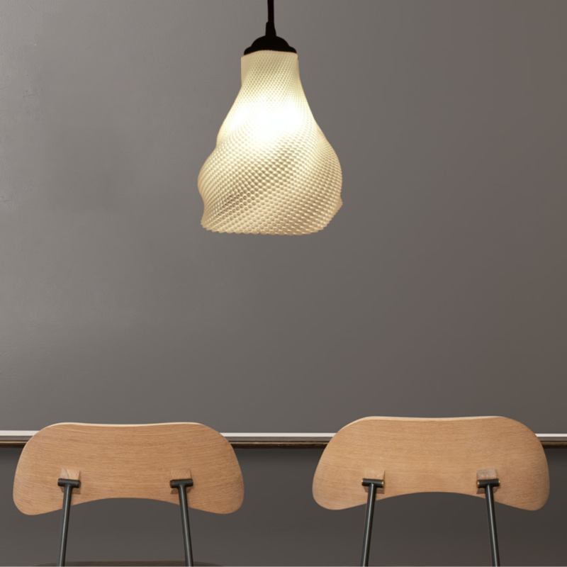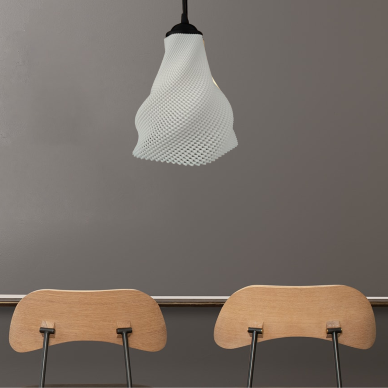 The lamp features a gracefully twisted design, giving the shade a dynamic and elegant appearance. The material appears to be a smooth, opaque white, which diffuses light softly and evenly. Its spiraling pattern adds a sense of movement and modern sophistication, making it a versatile piece for contemporary or minimalist interiors. Perfect for dining areas, bedrooms, or other spaces where soft, warm lighting is desired.